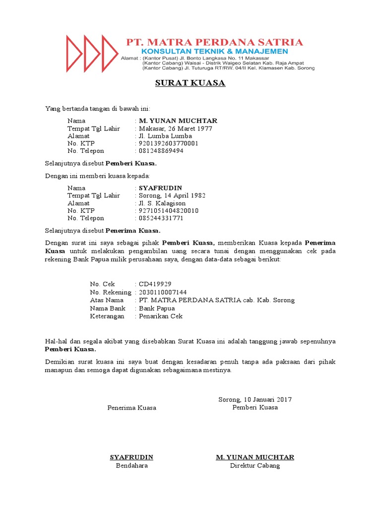 Surat Kuasa Pengambilan Cek Contoh Pdf